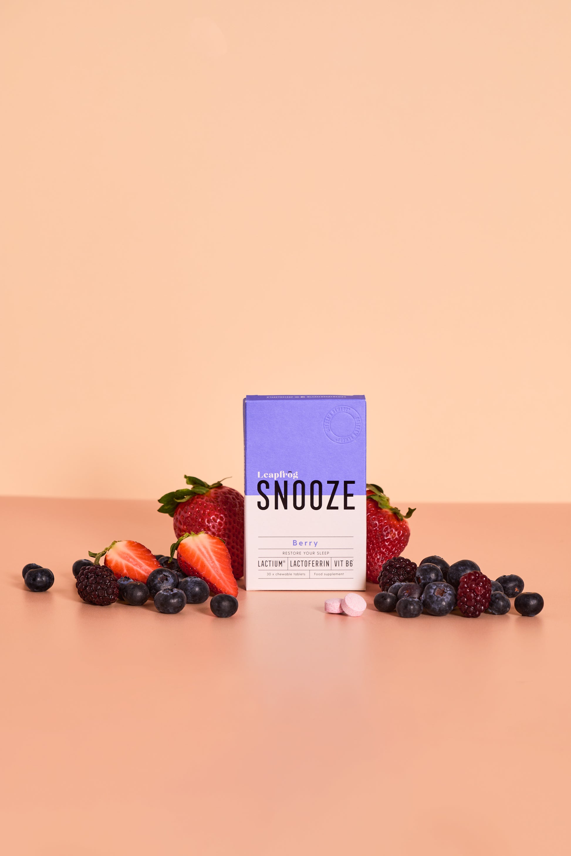 Leapfrog SNOOZE is your gentle but effective wind-down ritual, designed to calm the nervous system and support a better night’s sleep — without sedatives, grogginess, or the need to brush your teeth. Each berry-flavoured chewable tablet delivers a targeted blend of Lactium®, Lactoferrin, and Vitamin B6 to help ease stress and promote relaxation, so you can drift off naturally and wake up refreshed.