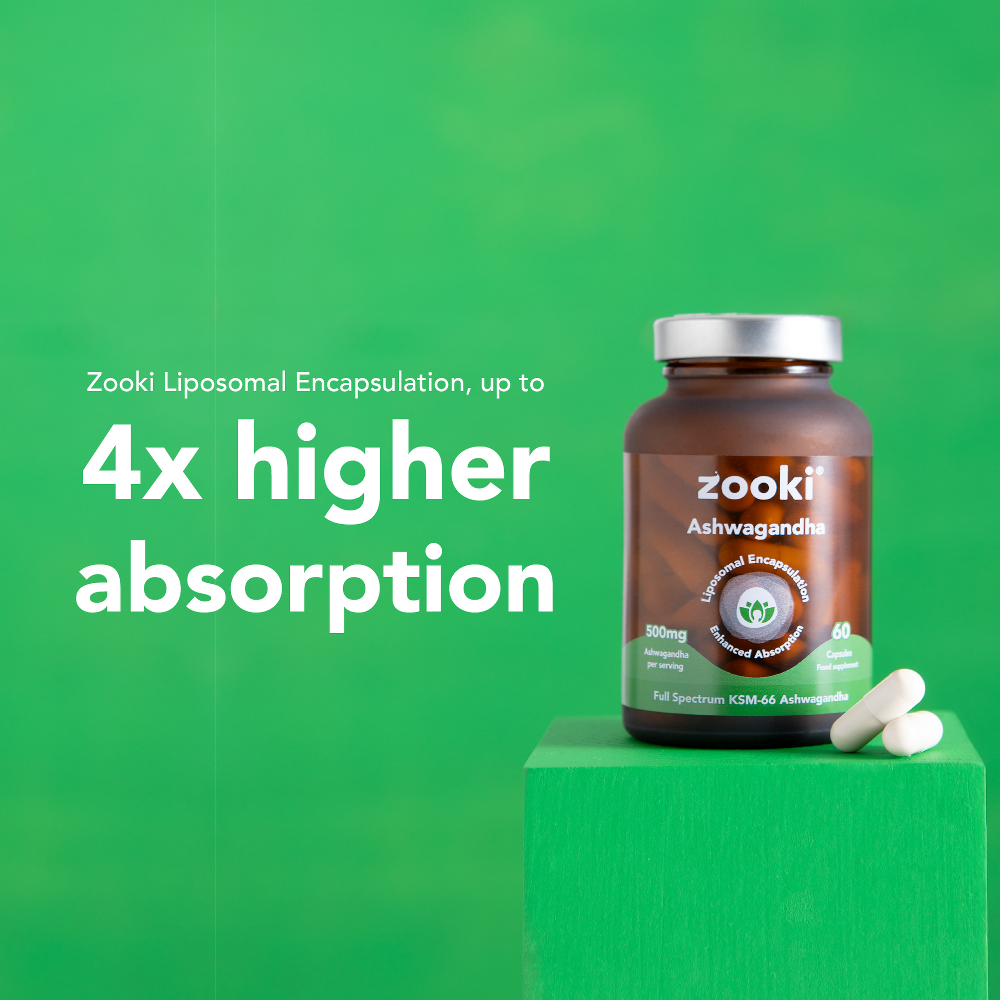 Zooki uses the world’s first liposomal KSM-66® ashwagandha, pairing the most researched full-spectrum extract with lipid-based delivery for enhanced bioavailability. The result is a supplement that provides up to 4x greater absorption than standard ashwagandha capsules.