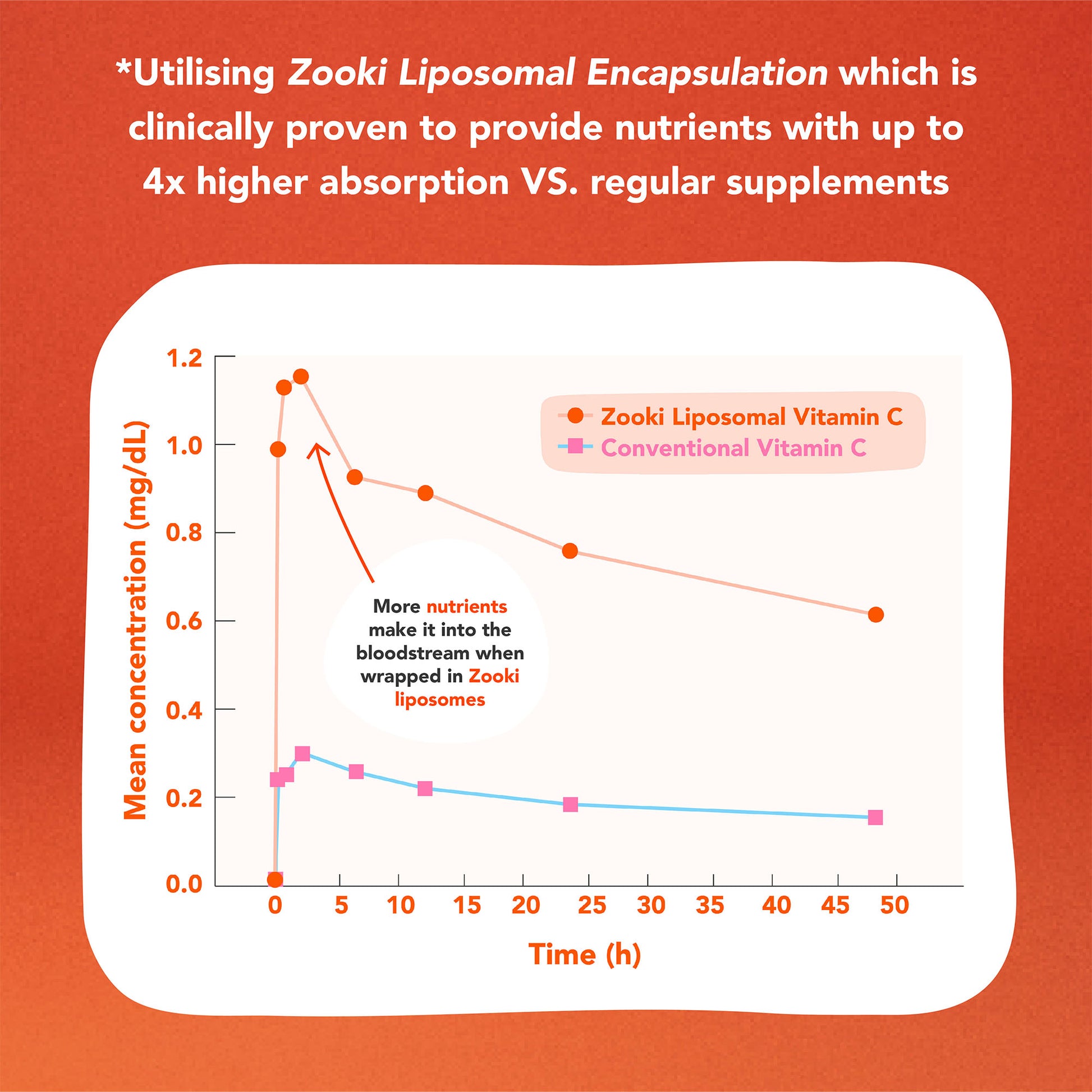Formulated with liposomal encapsulation, Zooki Vitamin C wraps each molecule in sunflower-derived phospholipids — shielding it from digestive breakdown and delivering it efficiently into the bloodstream. That means 4x greater absorption than conventional tablets or powders.