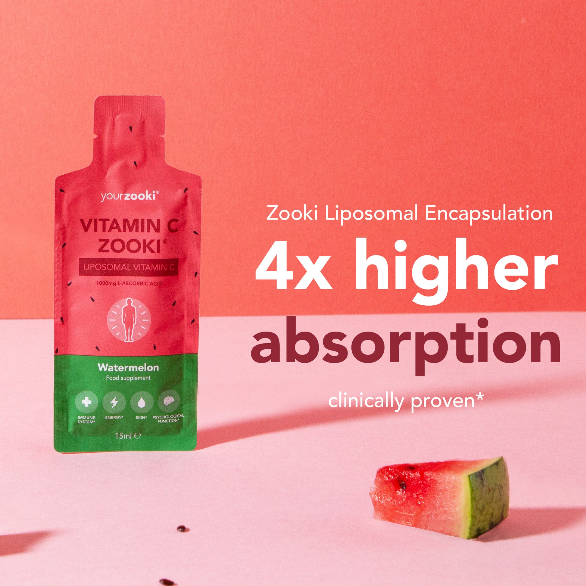 Support your immunity, collagen production, and daily energy levels with Zooki Vitamin C, a high-strength liposomal formula that delivers 1000mg of Vitamin C with every convenient on-the-go sachet — all with a refreshing watermelon flavour and none of the nasties.